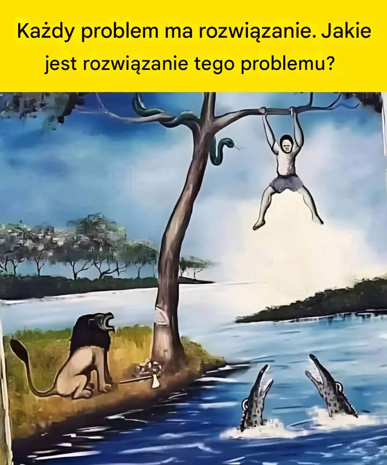 W tym scenariuszu mężczyzna stoi otoczony śmiertelnymi zagrożeniami ze wszystkich stron. Po jego prawej stronie czeka wąż gotowy do ataku. Po jego lewej stronie znajduje się drzewo, które mogłoby się przewrócić do jeziora pełnego krokodyli. Nieopodal, po okolicy grasuje lew. Początkowo nie ma drogi do bezpieczeństwa i nie ma wyraźnego wyjścia. Ale rozwiązanie leży w czekaniu. Jeśli mężczyzna będzie cierpliwy, lew w końcu uda się do jeziora, aby się napić, rozpraszając krokodyle. W tej chwili zamieszania mężczyzna może cicho wymknąć się niezauważony. Ta zagadka dowodzi, że czasami przetrwanie zależy bardziej od wyczucia czasu i spokoju niż brutalnej siły lub szybkości.